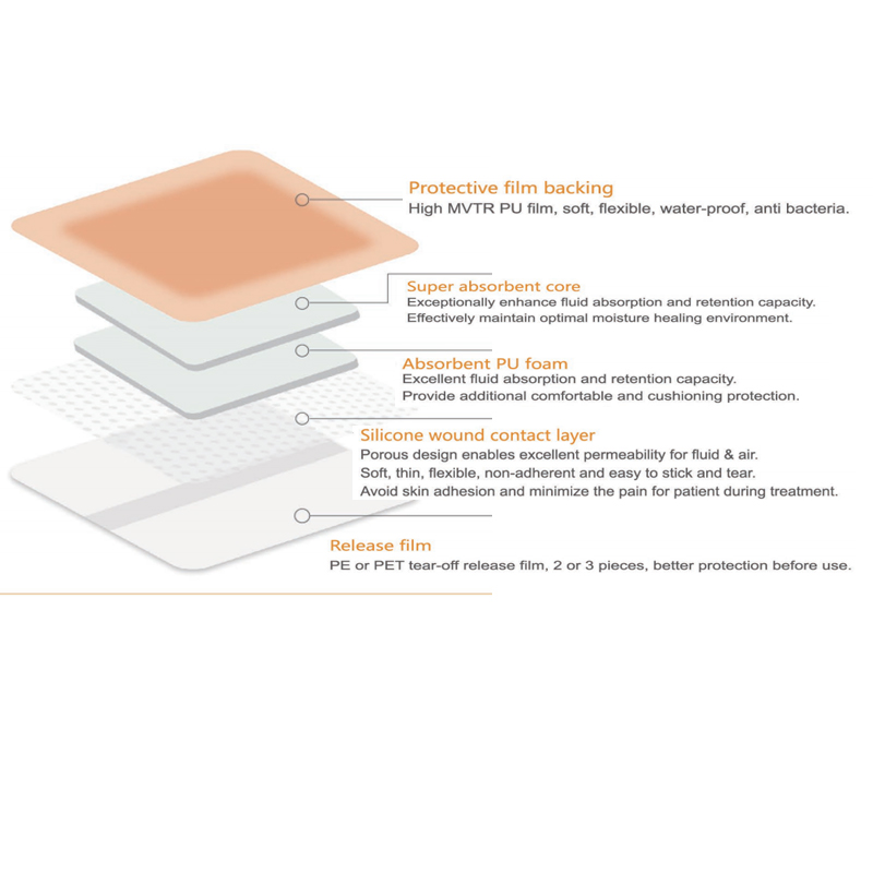 Reunattu silikonivaahtosidos on itsekiinnittyvä sidos, jossa on ylimääräinen reunustettu sidos, joka koostuu suojaavasta flm-taustasta, erittäin imukykyisestä ytimestä, imukykyisestä PU-vaahdosta, silikonista haavakontaktikerroksesta ja irrotuskalvosta.