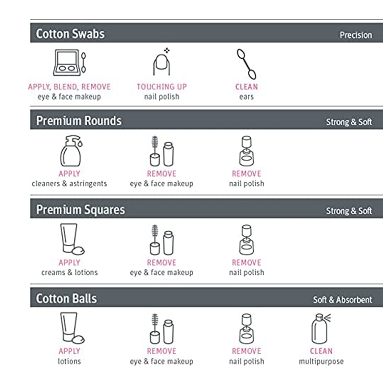Ihanteellinen meikin ja kynsilakan poistoon, puhdistusaineiden, supistajien ja lotionien levittämiseen.