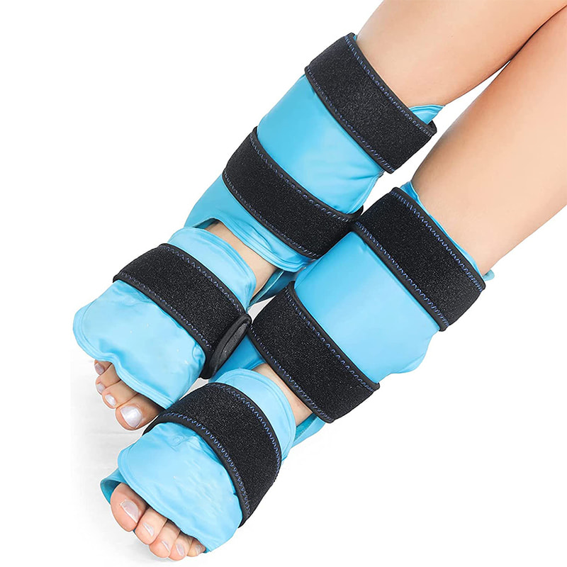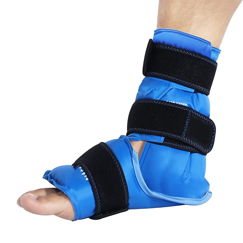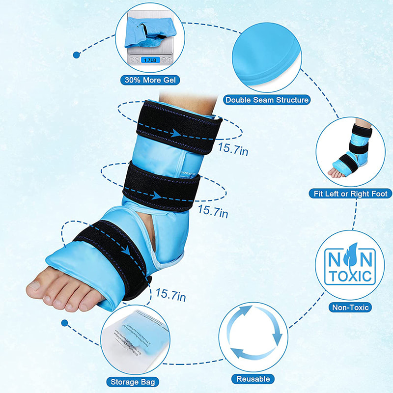 Nilkan jääpakkaus, jossa on 360 asteen täyssuojusrakenne, voi kietoa nilkan ja jalkaterän kaikkiin suuntiin, mikä voi tehokkaasti lievittää harjoituksen jälkeistä lihaskipua tai vamman jälkeistä turvotusta.