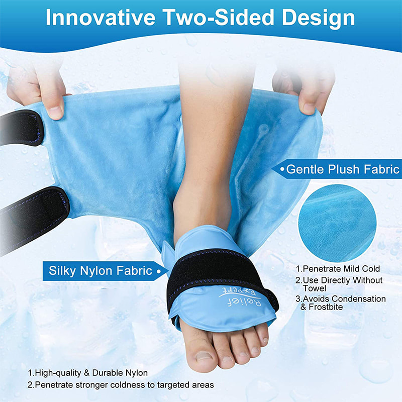 Jalkajääpakkauksen toinen puoli on superpehmeää minky-kangasta, joka voi eristää kondenssiveden ja välttää paleltumia, tunkeutua lievään kylmyyteen ja käyttää suoraan loukkaantuneille alueille.