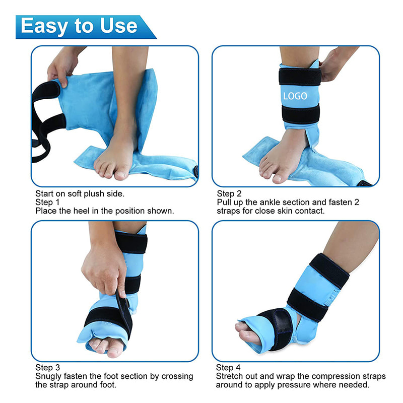 Nilkkajääpakkauksen mukana tulee joustavat neopreenihihnat, jotka voidaan helposti säätää nilkkojen mukaisiksi ja jotka tarjoavat tehokkaan kylmäkompressiohoidon nilkkakipujen, jalkakipujen ja kantapääkipujen rauhoittamiseksi.