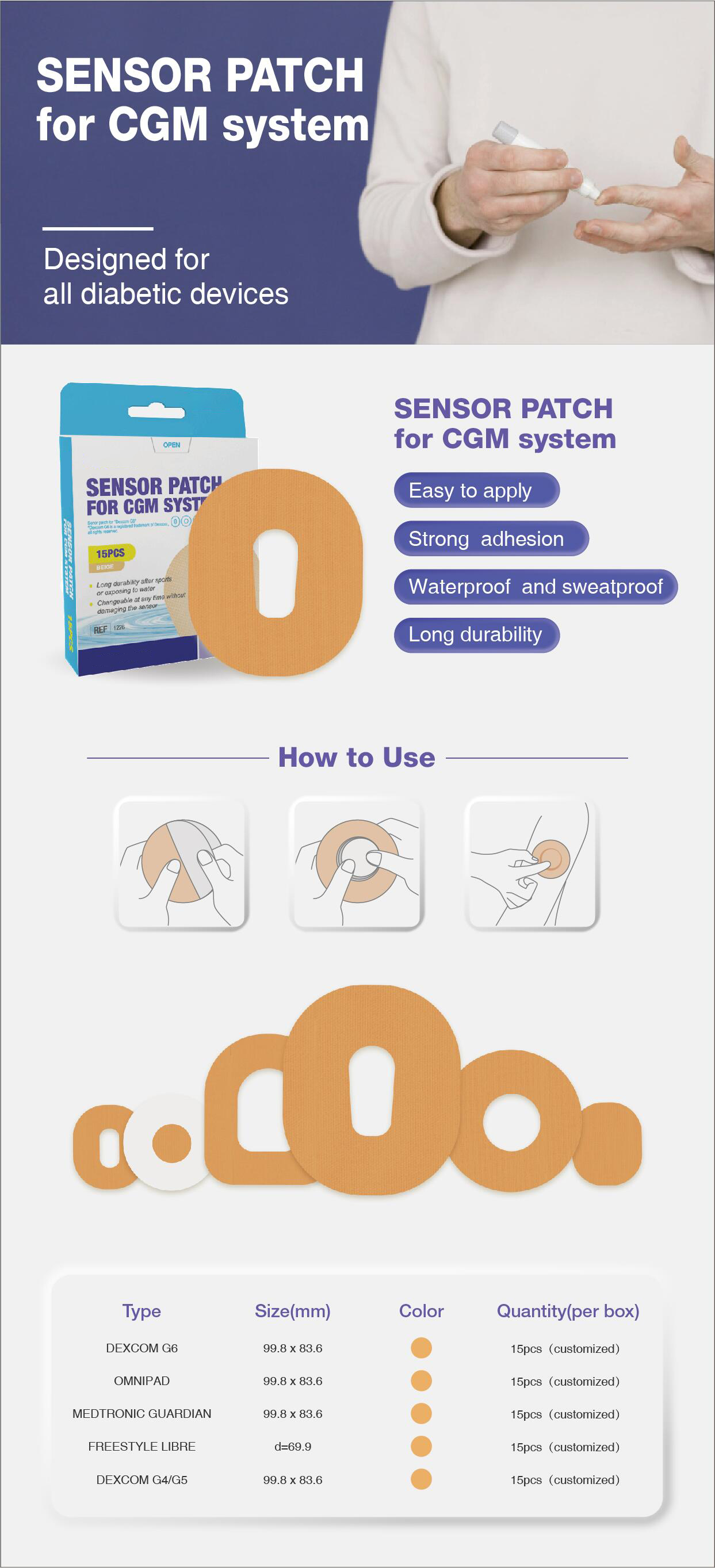 CGM Adhesive Patches maintain secure adhesion for up to 10 days with water and sweat resistance.