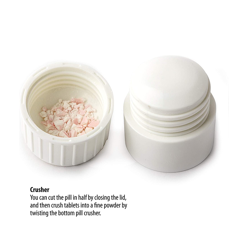 Voit leikata pillerin kahtia sulkemalla kannen ja murskata tabletit hienoksi jauheeksi kiertämällä pohjapillermurskain.