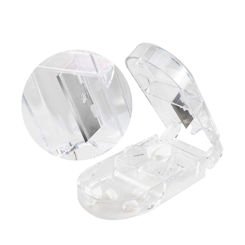 Pillerileikkuri on selkeästi läpinäkyvä, mikä tekee siitä erinomaisen kohdistamaan pillerin keskilinjan.