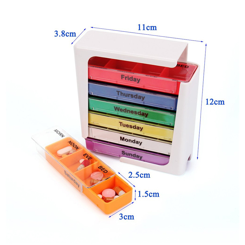 Ulkokuori on suunniteltu läpinäkyväksi, ja jokaisessa lokerossa on ainutlaatuinen kirkas väri, jonka avulla käyttäjä voi helposti erottaa viikonpäivät.