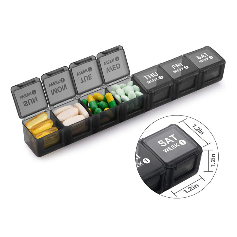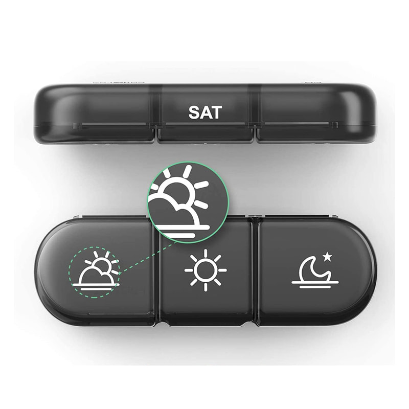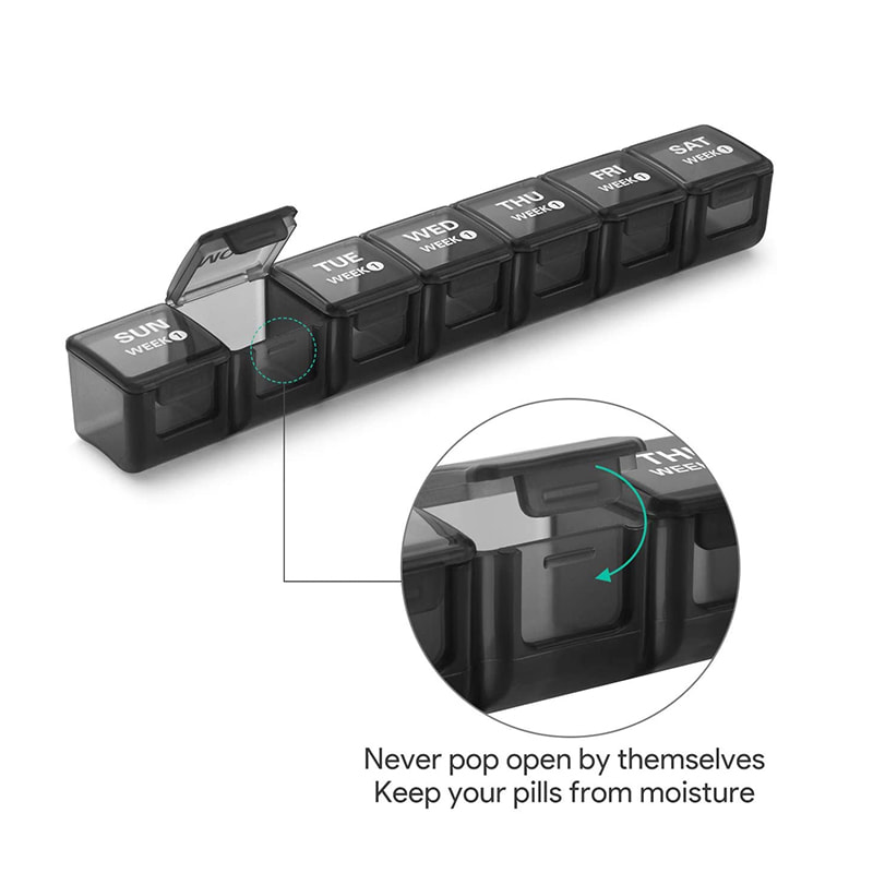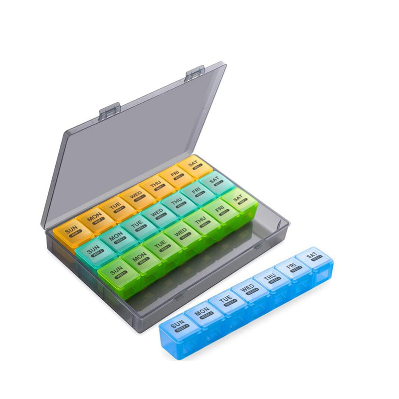 Päivittäiset pillerirasiat on valmistettu elintarvikelaatuisesta PP-muovista, kun taas ulkosäiliö on valmistettu ABS-muovista, BPA-vapaa ja turvallinen lääketieteelliseen käyttöön.