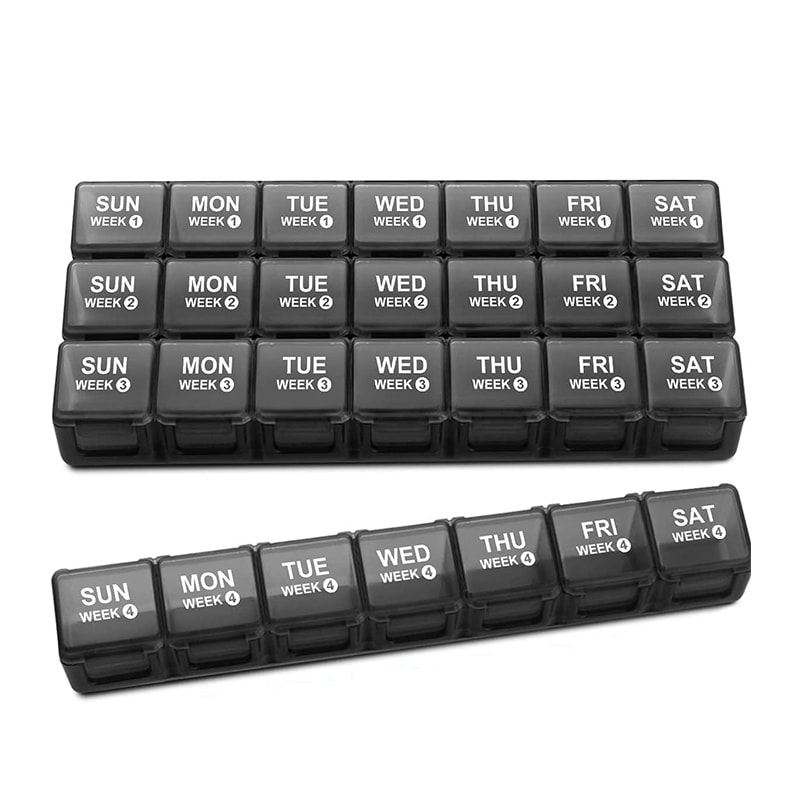 Pillerasiassamme on neljä yhden viikon pillerisäiliötä, jotka pitävät kuukauden lääkkeesi järjestyksessä ja pystyt ylläpitämään AM/PM-lääkitysohjelmaasi.