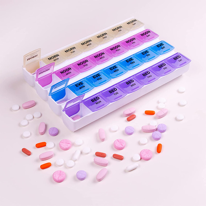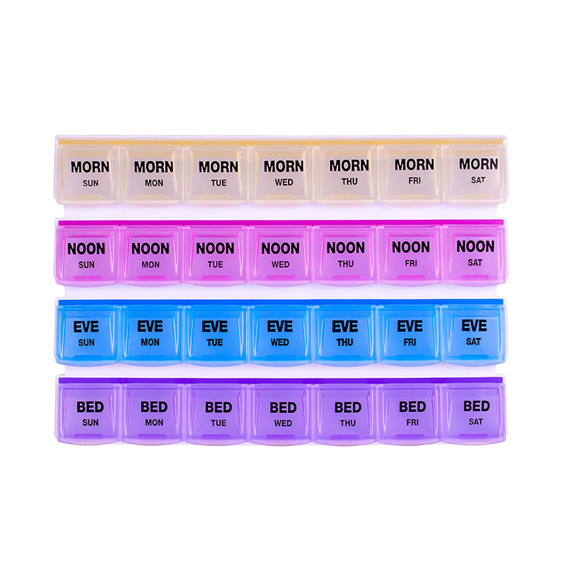 Tämä 7 päivän pillerirasia antaa sinun järjestää lääkityksen aamulla, iltapäivällä, illalla ja nukkumaanmenoa varten. Värikoodattujen, läpinäkyvien, helposti avattavien kansien avulla on helppo tarkistaa, että olet järjestänyt ja ottanut pillerit oikein
