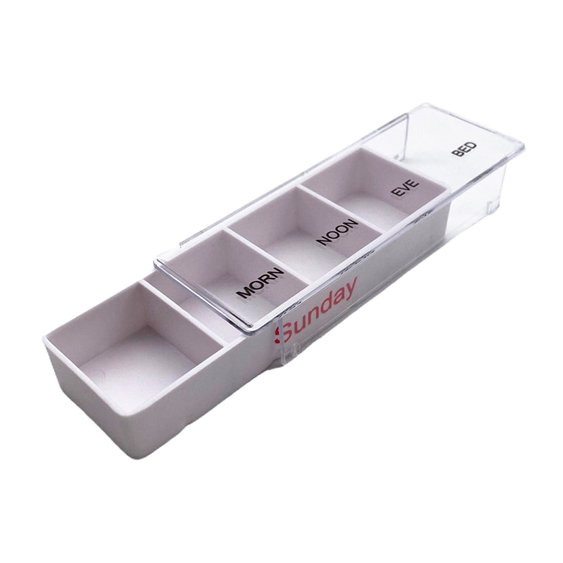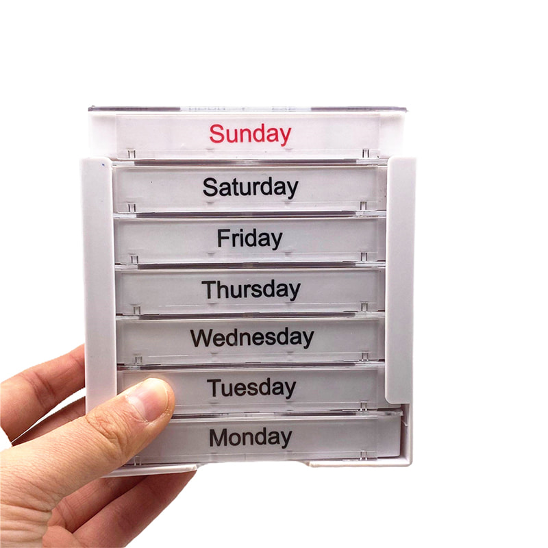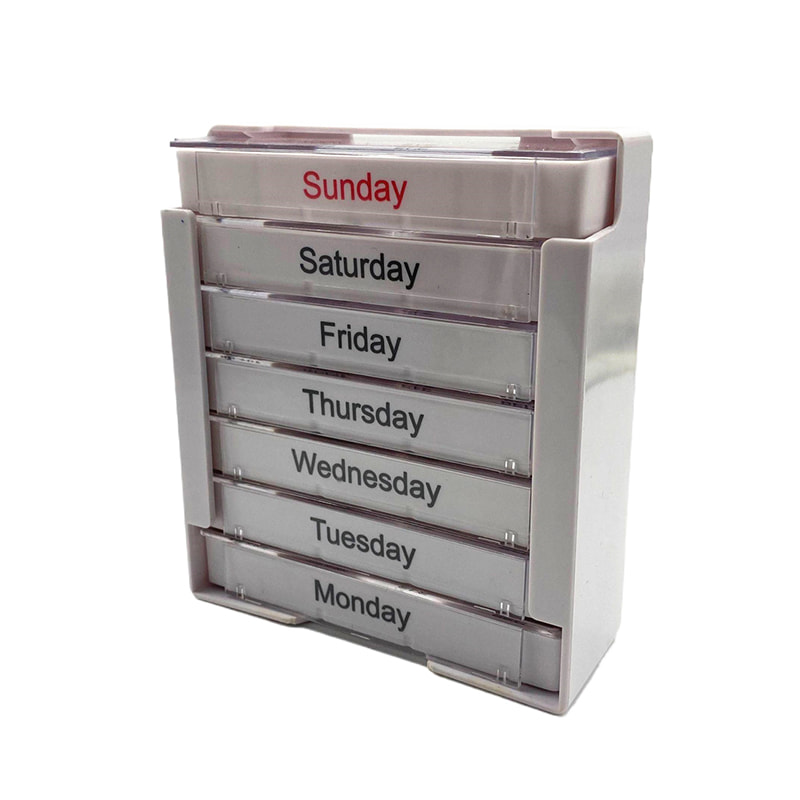Ulkokuori on suunniteltu läpinäkyväksi, ja jokaisessa lokerossa on ainutlaatuinen kirkas väri, jonka avulla käyttäjä voi helposti erottaa viikonpäivät.