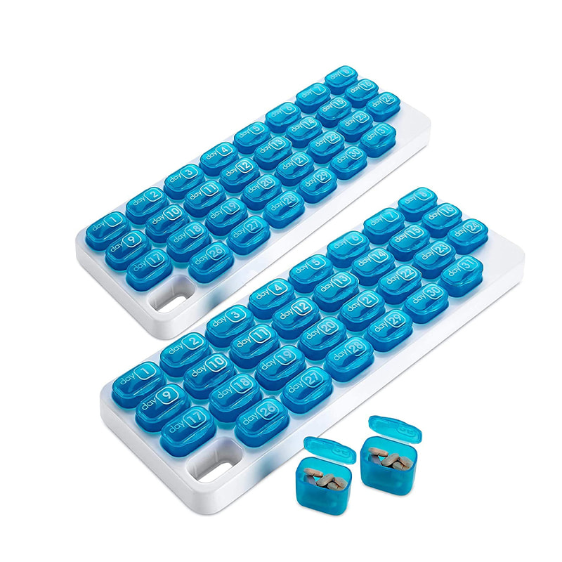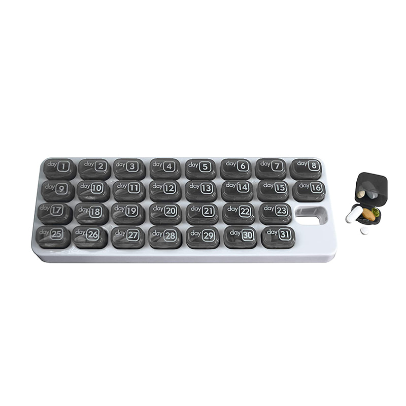 Suunniteltu kuukausittaisten lääkkeiden ja vitamiinien päiväannosten järjestämiseen kotona ja se voidaan helposti irrottaa tien päällä matkustamista varten.