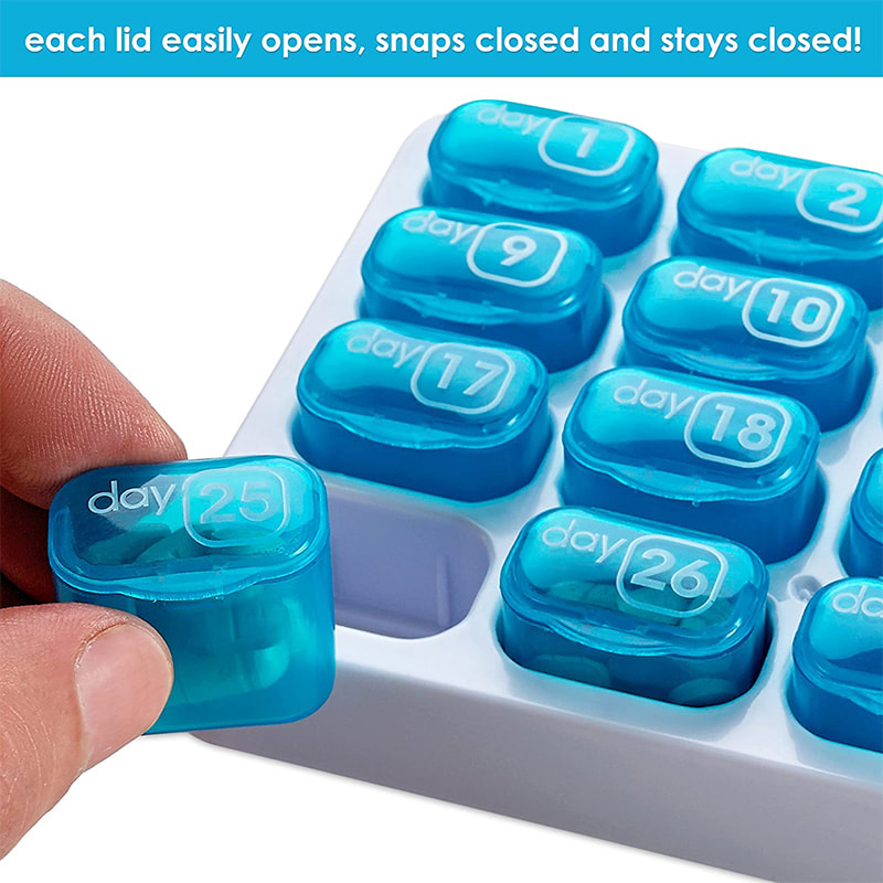 Palot on numeroitu vastaamaan kuukauden päivää käytön helpottamiseksi, jolloin on helppo muistaa, mikä päivä ja annostus on käytössä.