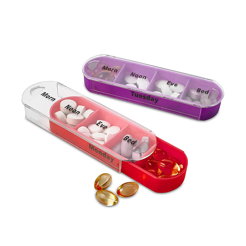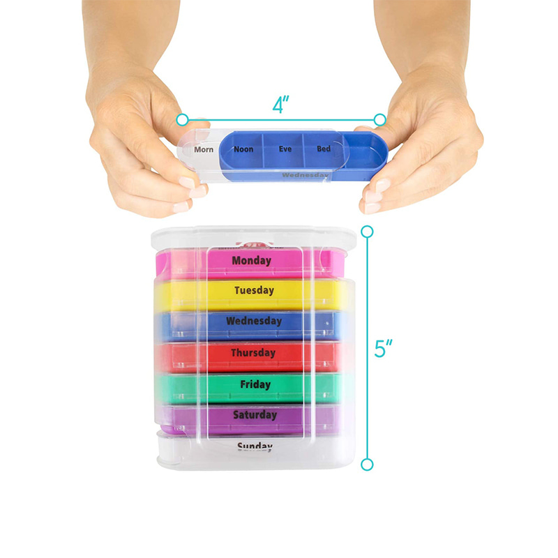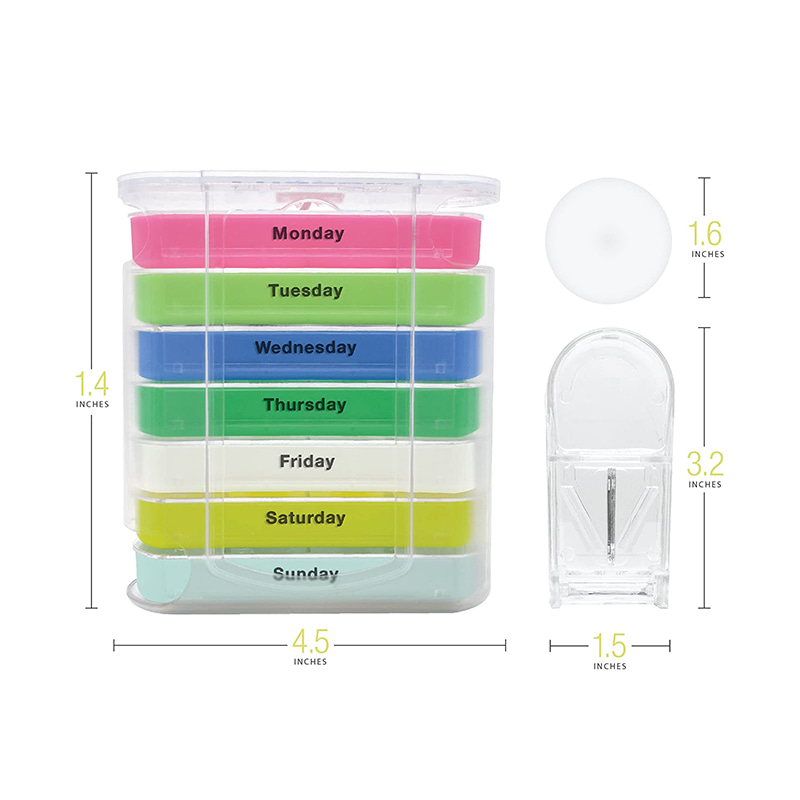 Ulkokuori on suunniteltu läpinäkyväksi, ja jokaisessa lokerossa on ainutlaatuinen kirkas väri, jonka avulla käyttäjä voi helposti erottaa viikonpäivät.