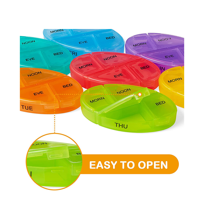 Jokaisessa päivittäisessä pillereiden järjestäjässä on napsautettavat kannet, jotka estävät ponnahtamisen auki, vaikka ne olisivat pudonneet. Tehokas ehkäisemään pillerin läikkymistä.
