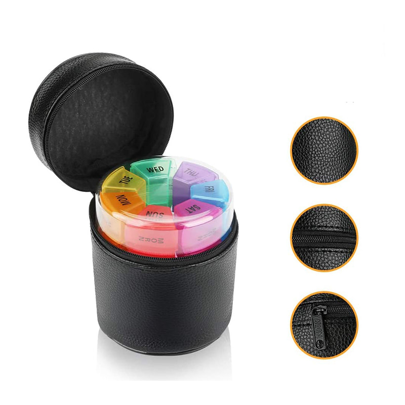 Päivittäinen pillerikotelo on varustettu ensiluokkaisella, vetoketjullisella nahkalaatikolla.