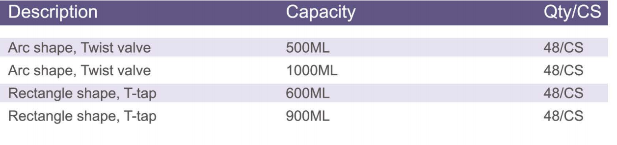 Tilavuus saatavilla 350 ml, 500 ml, 600 ml, 750 ml, 800 ml,