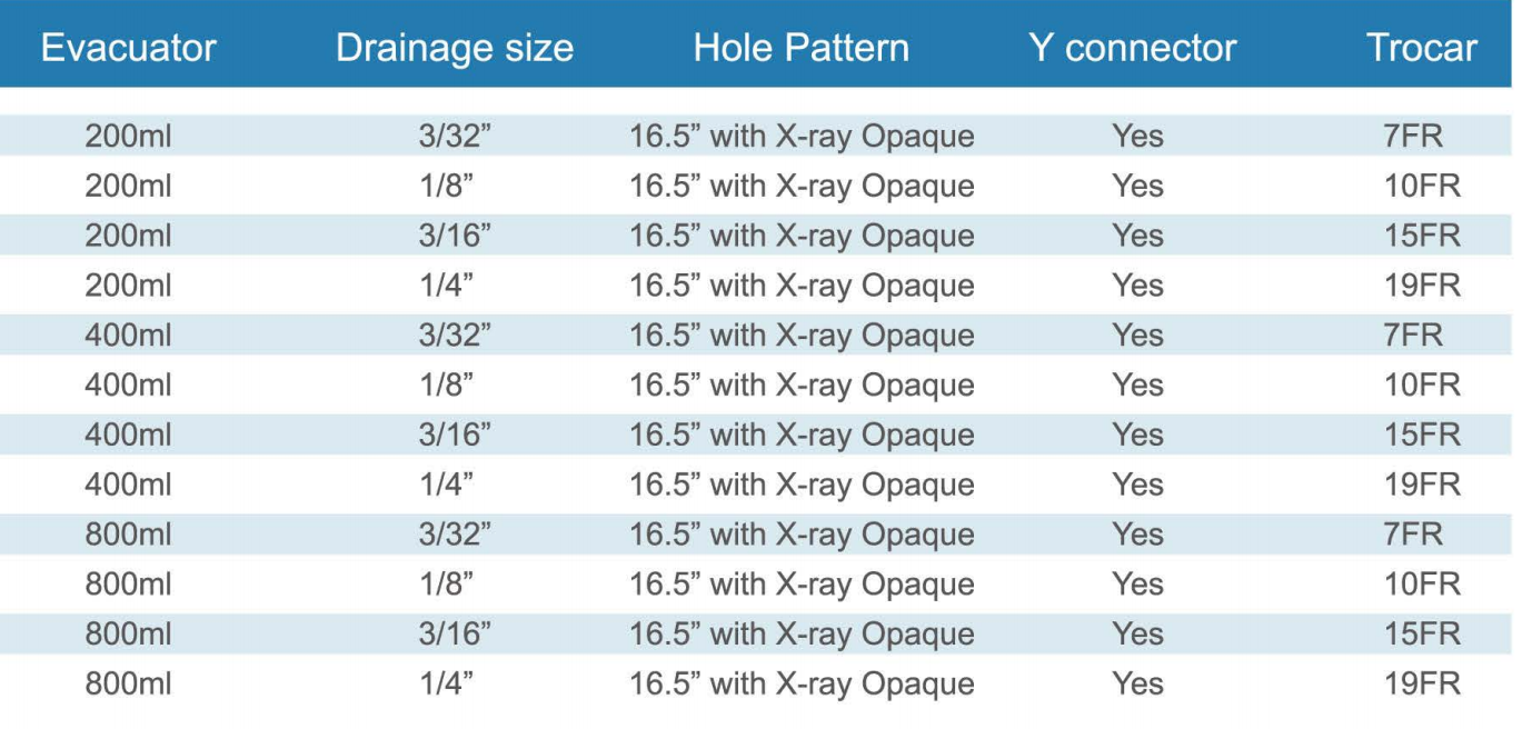* Suljettu haavatyhjennysjärjestelmämme, mukaan lukien 400cc3-jousityhjennys,·PVC-letku ja "Y"-liitin sekä tyhjennys troakaarilla.